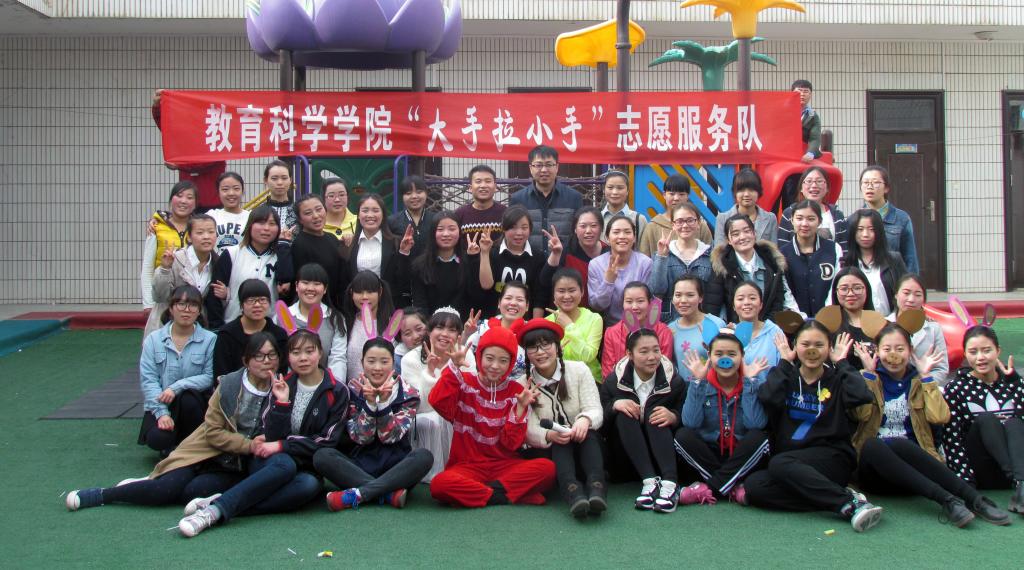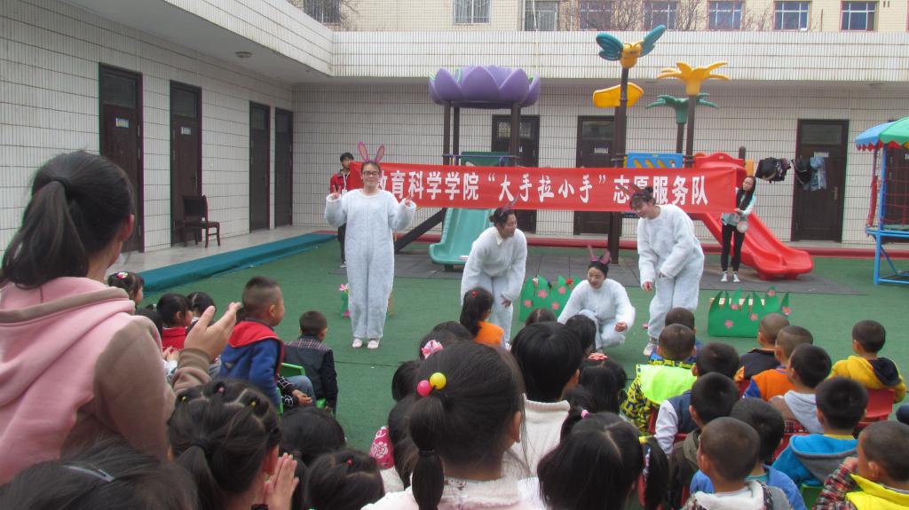 2015年3月27日,辅导员高飞翔带领我院“大手拉小手”义务演出队(学前13全体同学组成)赴附属幼儿园开展义演活动。活动主要以生动、通俗易懂的话剧表演为主,其中穿插互动环节充分调动起了现场气氛,小朋友们热情高涨,积极参与其中,以新潮的舞蹈《小苹果》回应志愿者精心筹备活动。