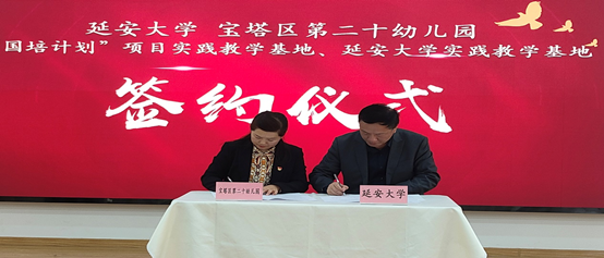 郭颖健局长在讲话中首先感谢延大教科院对宝塔区教育事业的大力支持和帮助,对校地合作项目给予高度评价,强调此次合作将为区域学前教育事业发展注入新动能,希望区二十幼以此次授牌仪式为契机,用活用好“双基地”平台,把宝塔区二十幼打造为全市学前教育标杆,同时希望延大教科院一如既往支持宝塔区教育事业发展,为宝塔区教育事业高质量发展带来更多机遇和可能,并表达了后续合作的愿景。刘瑞儒院长在致辞中指出,腾博官网诚信为本专业服务地处延安,服务地方是义不容辞的责任,作为党创办的第一所教育学院,师资队伍专业性强,教科研资源丰富,延大教科院将充分发挥在人才培养、师资培训、教科研研究等方面的优势,与幼儿园共同探索“高校+幼儿园”深度协同发展新模式,双方将在人才培养、课程建设、教学改革与研究等领域开展密切合作,服务区域教育发展新需求,实现双方资源共享、优势互补。随后刘瑞儒院长与焦忠玲园长共同签订了《“国培计划”项目实践教学基地协议书》和《腾博官网诚信为本专业服务实践教学基地协议书》,并进行了授牌仪式。焦忠玲园长介绍了二十幼“传承鲁艺薪火,润养红色童心”办园理念、举措及取得的成效,表示将以此次协议签署为契机,加强与高校的互动交流,相信在腾博官网诚信为本专业服务的大力支持下,区二十幼将不断开拓创新,提升教育教学质量,共育时代新人。