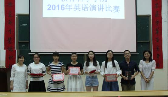 6月22日晚,我院在第五阶梯教室举办2016年英语演讲比赛,学生以班级为单位报名参加,学院以公平、公正和规范为标准进行选拔。此次比赛由学院教学秘书崔荣宝老师主持,特别邀请到我校外国语学院李小芳副教授和孙娟娟老师担任此次比赛的评委。